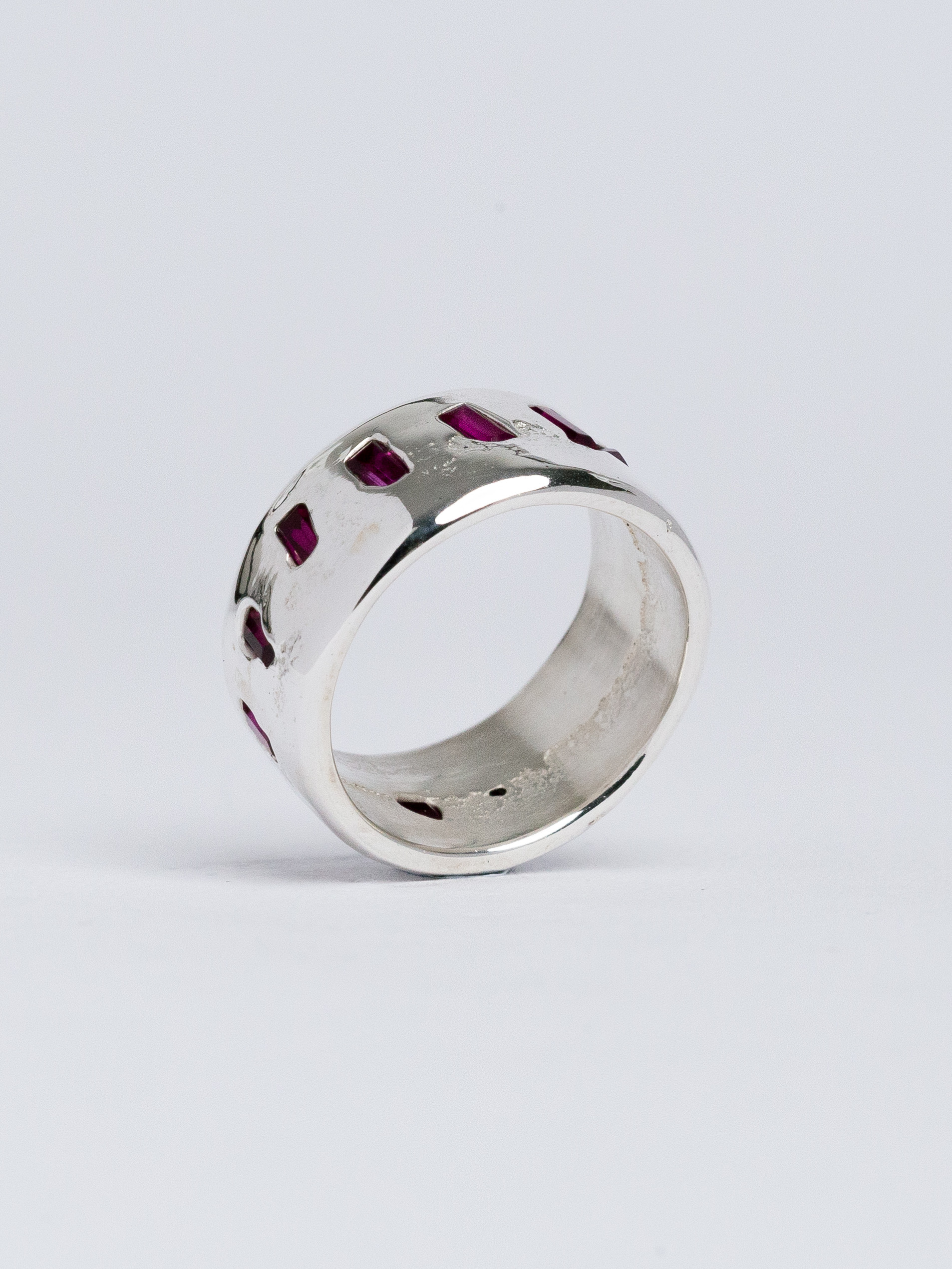 A thick silver band featuring a vibrant equator of lab-grown baguette cut rubies, sown with a semblance of order. Our evolution must continue.