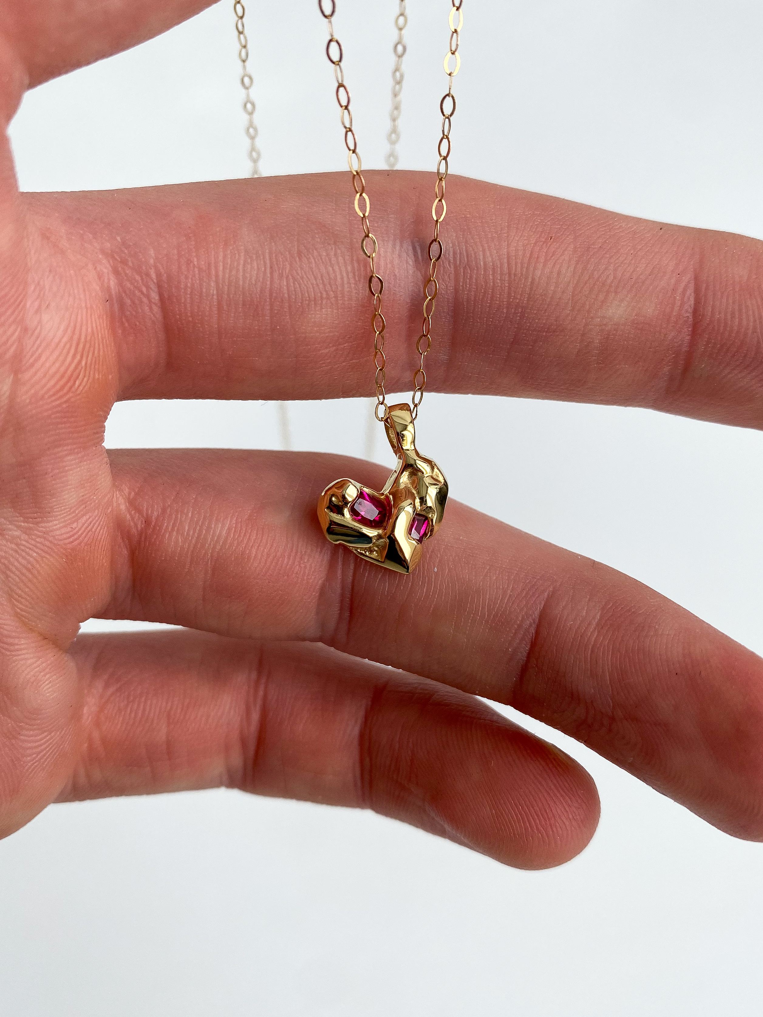 A small heart-shaped pendant, combining gloopy organic forms with straight lines and two vibrant lab-grown rubies. Embodying the necessary harmony between us, nature, technology and love.